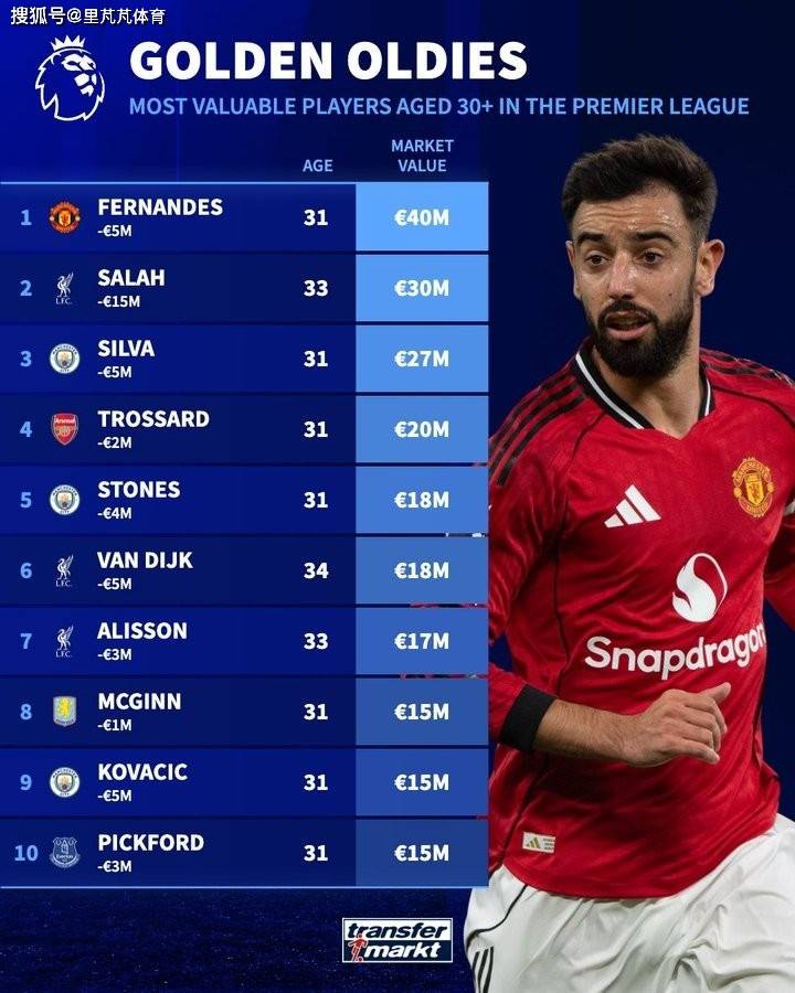 德国转会市场统计了英超30岁以上球员身价排名,曼联队长布鲁诺·费尔南德斯排名第一。